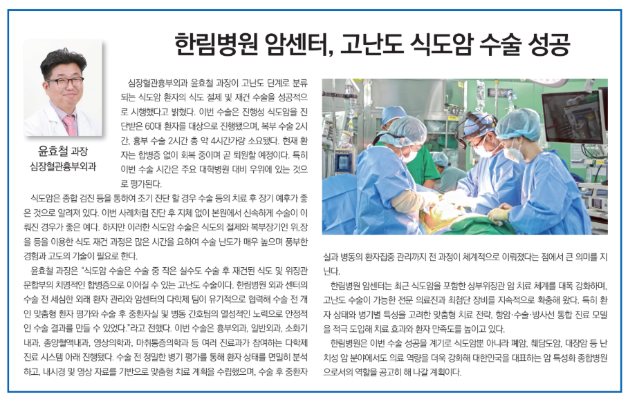 [1월 건강정보] 한림병원 암센터, 고난도 식도암 수술 성공